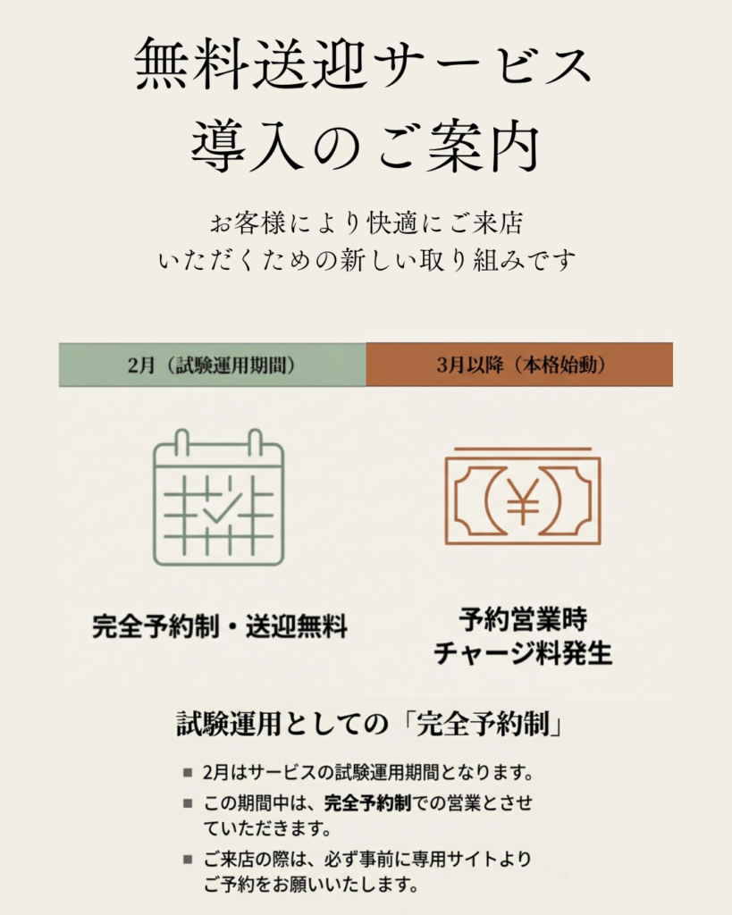 送迎は店主自ら行うため、送迎中の営業体制を考慮し、送迎をご希望のご予約が入った場合は、店内を完全貸切での営業とさせていただきます。